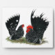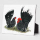 Mottled chickens are glossy black with every second or third feather tipped in white. These Japanese bantams demonstrate the colour pattern nicely.