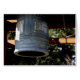 Close-up view of a heavy cast iron Japanese bell with writing painted on it in white. The bell is rung by grasping the pole and pushing back and forth.