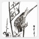 Digital enhancement of an antique Japanese sketch of a sparrow perched on a branch of cherry blossoms, rendered in a black ink effect on a white background
