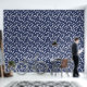 Vector illustration of stylised white sakura cherry blossom flowers and swirls on blue background. Inspired by traditional kimono fabric patterns of Japan.