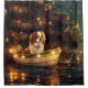 Set sail into the magic of the holiday season with this beautifully detailed illustration, showcasing a proud dog sitting in a festively decorated boat, gliding across a serene Christmas lake. The twinkling lights from nearby pine trees reflect off the water, casting a warm, festive glow that enhances the cosy ambiance. Ornaments dangle from the boat's sides, while glowing lanterns light the way, creating a scene that captures the true essence of Christmas warmth and joy. This nostalgic artwork brings a touch of holiday magic to any space, perfect for those who cherish the spirit of the season.