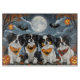 Unleash the spooky spirit with this eerie Halloween design featuring a pack of dogs under a dark, moonlit sky, surrounded by flying bats and glowing pumpkins. Perfect for those who love a touch of frightful fun with their furry friends!