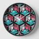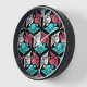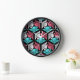 Clock in a classic Japanese kimono pattern of stylised cranes, arranged in a pattern of hexagons, in coral pink, turquoise, and white, on a black background