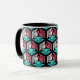 Mug in a classic Japanese kimono pattern of stylised cranes, arranged in a pattern of hexagons, in coral pink, turquoise, and white, on a black background