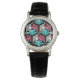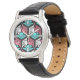 Watch in a classic Japanese kimono pattern of stylised cranes, arranged in a pattern of hexagons, in coral pink, turquoise, and white, on a black background