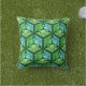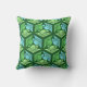 Outdoor pillow in a classic Japanese kimono pattern of stylised cranes, arranged in a pattern of hexagons, in pale and medium jade green and light sky blue, on a dark jade green background