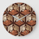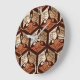 Clock in a classic Japanese kimono pattern of stylised cranes, arranged in a pattern of hexagons, in tan, rust / terracotta, and cream, on a dark chocolate brown background