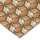 Table runner in a classic Japanese kimono pattern of stylised cranes, arranged in a pattern of hexagons, in tan, rust / terracotta, and cream, on a dark chocolate brown background