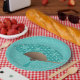 A classic Japanese fan paper plates in the traditional Japanese Asanoha, or star pattern, in turquoise outlined in pale ice blue, on a coordinating patterned background