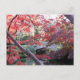 The simple wooden arc forms a small bridge over a stream. Japanese maples, glimmering red in the autumn sun, grow along the water. The photo was taken at the Japanese Garden in Fort Worth, Texas.