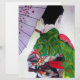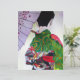 From an original watercolour painting by artist Sacha Grossel of a Japanese Geisha with a green decorated, fashionable kimono and black and red obi holding a purple umbrella decorated with flower blossoms. This Japanese and Kyoto inspired design is influenced by oriental and Asian art and by Japanese traditional fashion design.