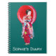 From an original painting by artist Sacha Grossel of a Japanese Geisha dressed in traditional costume carrying an umbrella and dressed in a red and pink kimono. This cute Asian art style illustration is colourful and the background colour can be changed to suit your taste. Perfect for a notebook or diary of diary gift for teen girl. Customisable text.