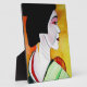 with original art design from watercolour painting by Sacha Grossel of Japanese Geisha with green kimono. This geisha is inspired by Asian, oriental, Japanese style and has a yellow background.