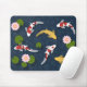 Beautiful minimalistic vector illustration of colourful Japanese koi fish swimming among the water lilies in a pond. Koi is a brightly coloured ornamental variety carp domesticated in Japan.
