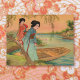 At a glance this image has the appearance of a woodblock print. Upon closer examination you will notice the graceful dot pattern of a stone chromolithograph of the Victorian period. The gentle colours and design illustrate a Japanese lakeside scene with two geishas and a boat. The willow trees and the apricot sky frame the colourful image. It is a delightful design for decor, personal correspondence and accessories. It invites your personal touch.