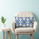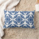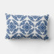 Lumbar pillow in a classic Japanese kimono pattern of stylised, four-way, medallions of leaves and flowers in deep cobalt blue on a white background