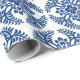 wrapping paper in a classic Japanese kimono pattern of stylised, four-way, medallions of leaves and flowers in deep cobalt blue on a white background