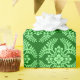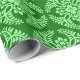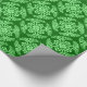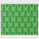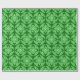 wrapping paper in a classic Japanese kimono pattern of stylised, four-way, medallions of leaves and flowers in light green on a dark jade green background
