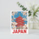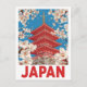 Celebrate the serene elegance of Japan with this vibrant travel postcard. The design features a striking red five-story pagoda framed dramatically by blooming white cherry blossoms (Sakura) against a bright blue sky. This artwork captures the classic beauty of Japanese spring and traditional architecture, making it an excellent souvenir or art piece for cultural enthusiasts and collectors of stylized Asian travel posters.