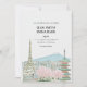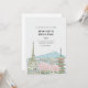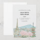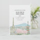 This wedding invitation features a japanese landscape of a traditional structure with sakura trees near it and a mountain in the background.