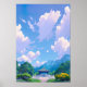This digital artwork captures the serene beauty of a small Japanese temple set against a summer sky adorned with fluffy white clouds. In the distance, majestic mountains grace the horizon, adding a sense of tranquillity and grandeur to the scene.