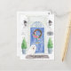 Announce your new address with our stylish announcement featuring a Japanese Spitz, blue front door, welcome mat, slate sign, topiaries and a floral wreath set on a grey brick background.