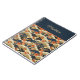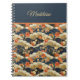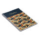 This vintage look personalised notebook features a Japanese kimono style print with white, teal, tan, and orange on dark teal-- almost black. Your name monogram, or your recipient's name, appears in gold text on a coordinated colour block of dark teal, bordered by orange.