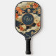 This retro look pickleball paddle features a Japanese style print -- similar to patterns from kimonos -- with white, teal, tan, and orange on dark teal-- almost black. Your monogram initial appears in gold text on a coordinated color block of dark blue teal, bordered by orange. This paddle a great gift for the pickleball dink queen or king on your list.