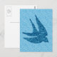 Postcard in a Mixed Media textile print of a swallow in flight, in a vintage Japanese cloud pattern of cobalt and pale blue against a swirl patterned background in blue and white