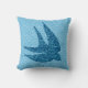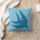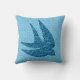 Throw pillow in a Mixed Media Silhouette of a swallow in flight, patterned with a vintage Japanese cloud pattern in cobalt and pale blue