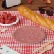 Digital reproduction of a repeating swirl pattern based on traditional Japanese textile designs, represents water or mist - deep Chinese red with a white background
