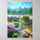 Indulge in the breathtaking beauty of a field covered in green grass and Sakura trees with this stunning digital artwork. In the distance, a small traditional Japanese temple stands, adding to the serene ambiance. Behind the temple, a lush green forest stretches towards the horizon, creating a peaceful and tranquil atmosphere.