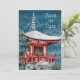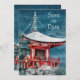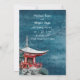 This wedding Save the Date invitation captures the oriental beauty of Japan. It has a beautiful blue background with a painted Japanese Buddhist temple and greenery.