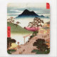 Vintage woodblock illustration of Japanese village with mountain in the background. Vintage rural Japanese life.