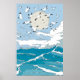 Japanese Vintage Seascape with seagulls flying over the sea.
