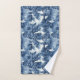 Serene Japanese water garden rendered in a blue and white porcelain effect. The scene features cascading waterfalls flowing over large, smooth rocks surrounded by lush trees and bushes. A prominent arched bridge spans a tranquil pond, reflecting the surrounding landscape. The overall colour scheme is a gradient of blue hues, creating a peaceful and harmonious atmosphere reminiscent of traditional porcelain artwork. The detailed depiction of natural elements like water, rocks, and vegetation highlights the tranquil beauty and intricate design typical of a Japanese garden.