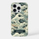 Make a statement with this iphone 15 pro phone case that features rolling Japanese waves in multiple shades of teal blue with splashes of earth tones. It's modern yet traditional. The pattern represents surges of good luck, peace, and eternal resilience. It becomes uniquely yours with your name in a CAP font in white on dark teal.