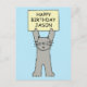 A cute cartoon grey cat holding up a lemon coloured sign that says 'Happy Birthday Jason'.