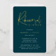 Invite guests to celebrate the happy couple with these modern and minimal rehearsal dinner invitations with luxe foil accents. Simple design features "rehearsal dinner" in casual gold foil handwritten script, with your event details beneath on a dark jewel tone emerald green background.