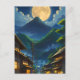 The moon shines over a small town in Java, Indonesia, with a large mountain in the background.