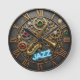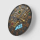 Unique Jazz Music Art Clock featuring Saxophone, Trumpet and blue neon light with word " jazz" set within industrial / steampunk motive with gears and cogs in gold with diamonds, ruby stones. Fabulous wall clock for musicians, jazz cafe club, patrons, players and music fans.