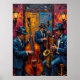 This painting depicts a jazz trio performing in a lively, abstract setting. Three musicians are dressed in dark suits and fedoras, with two playing double basses and one playing a saxophone. The background is a vibrant mix of red, yellow, and blue, with a textured door and two lamps. The artwork has a heavy impasto texture, with thick, expressive brushstrokes that capture the energetic and soulful atmosphere of a jazz performance.