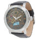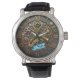 Unique Jazz Music Watch featuring Saxophone, Trumpet and blue neon light with " jazz" set within industrial / steampunk motive with gears and cogs in gold with diamonds, ruby stones. Fabulous watch for musicians, jazz club patrons, players and music fans.