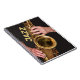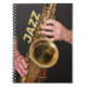 For jazz music fans! A personal sized, spiral bound notebook that features the photo image of a jazzman playing his time-worn, gold coloured, tenor saxophone horn along with the word, "JAZZ" printed in gold coloured block letters. Use as a journal or to keep important notes.