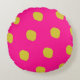 This round pillow showcases lime green polka dots over fuchsia surface.