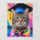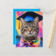A vibrant postcard with whimsical artwork. This charming tabby wearing a blue grad cap and a tie dye scarf behind a pscychedelic background .