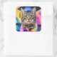 Vibrant square stickers with whimsical artwork. This charming tabby wearing a blue grad cap and a tie dye scarf behind a pscychedelic background .