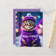 Holiday Postcard with vivid fantasy artwork. A jazzy tabby cat is dressed in purple winter attire.