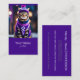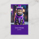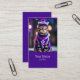 A business card featuring bright fantasy art. A jazzy tabby cat is dressed in a purple sweater and cap.Personalise it with your information right now... Canva AI and Alma Wad, a human designer, collaborated on the design.