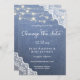 Things change. Send your guests a beautiful change the date wedding invitation due to this jean & lace with string lights invitation. Great for country and backyard weddings.